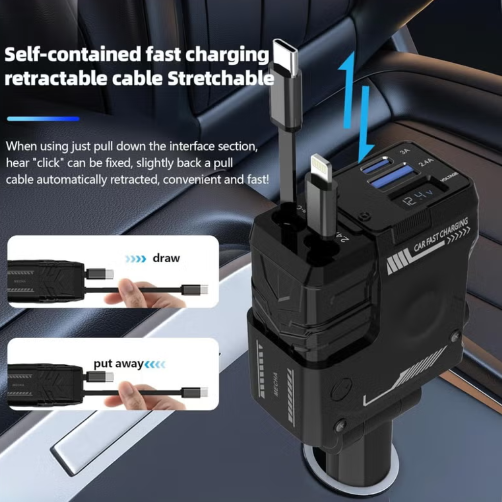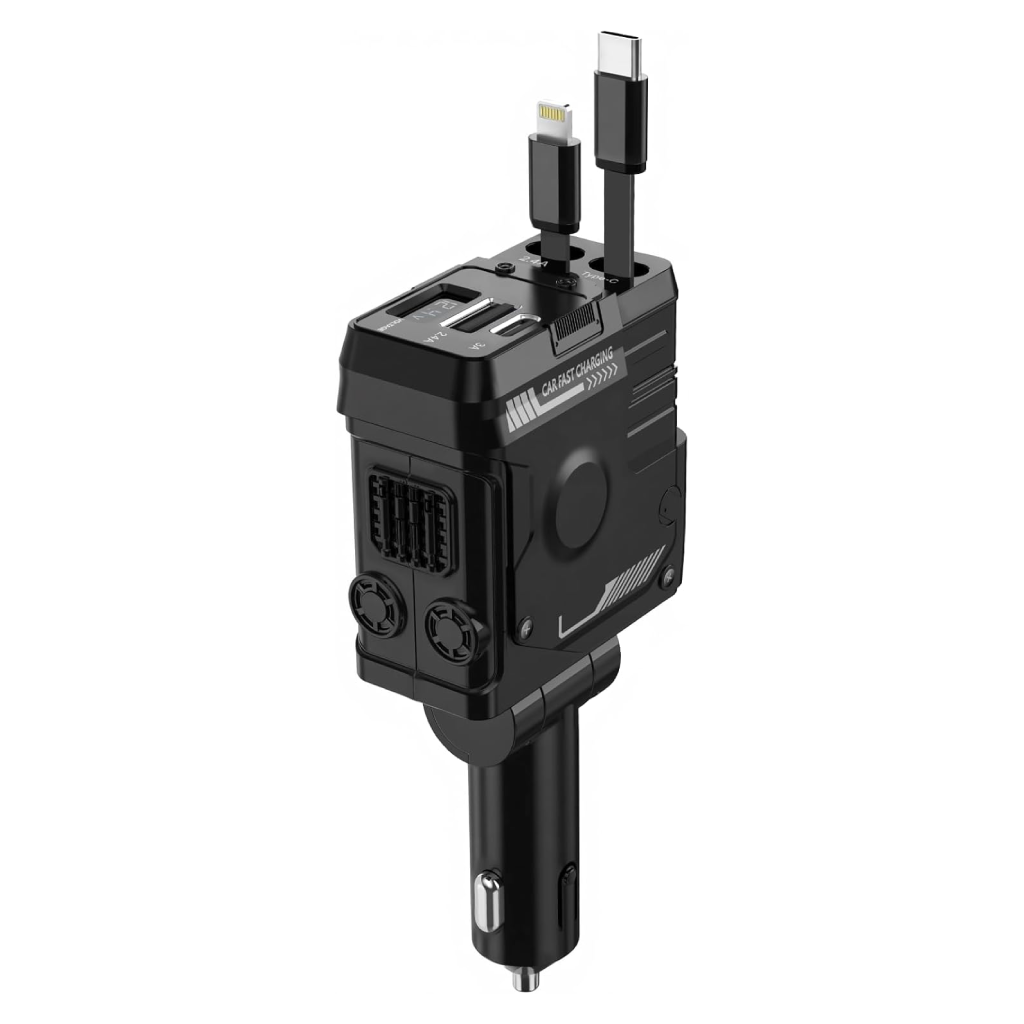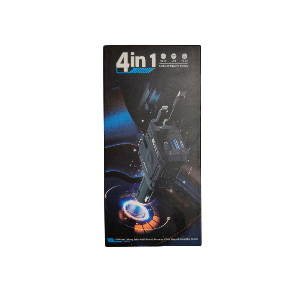 استمتع بتجربة شحن ذكية وسريعة مع شاحن السيارة 4 في 1 الجديد الذي يجمع بين القوة، الأناقة، والراحة في تصميم واحد مدمج.