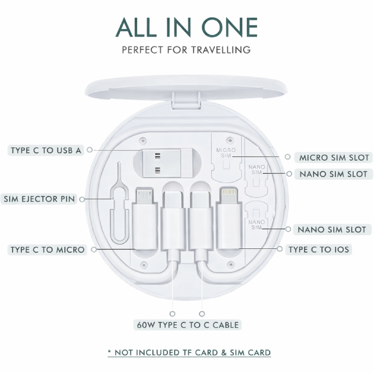 مجموعة كابل بيانات ستارت للشحن السريع متعدد الوظائف لأجهزة Apple وAndroid – Type-C مع حامل بطاقة SIM وصندوق تخزين دائري محمول