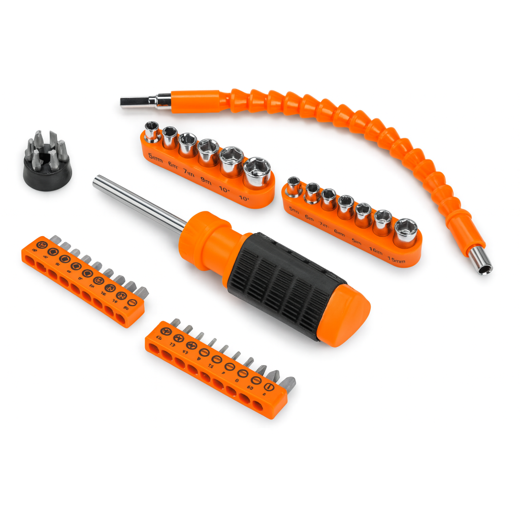 يتميز الطقم بمقبض مفك مريح مانع للانزلاق لتوفير تحكم مثالي أثناء الاستخدام، بالإضافة إلى وصلة مرنة بطول 30 سم للوصول إلى الأماكن والزوايا الضيقة بسهولة.