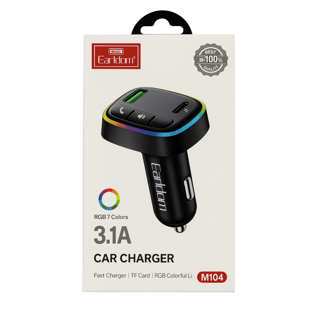 استمتع بتجربة شحن ذكية وموسيقى ممتعة أثناء القيادة مع Earldom M104، الشاحن متعدد الوظائف الذي يجمع بين الشحن السريع، البلوتوث، والإضاءة RGB المتغيرة في تصميم واحد أنيق.